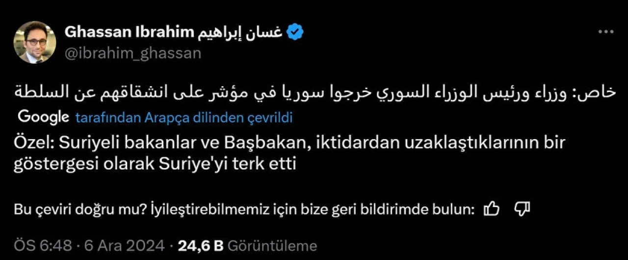 Gelen iddiaları destekleyen açıklamalardan biri de Gazeteci Ghassan Ibrahim oldu. Ibrahim, "Suriyeli bakanlar ve Başbakan, iktidardan uzaklaştıklarının bir göstergesi olarak Suriye'yi terk etti." gelişmesini de son dakika duyurdu.