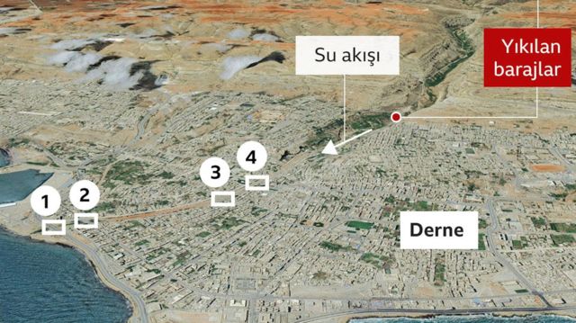 Derne fotoğraflarında mahallelerin seller sonucu tamamen Akdeniz'e sürüklendiği yerlerde kıyıya vuran cesetler görülüyor. Libya'nın doğusunu yöneten hükümetin sivil havacılık bakanı Hichem Abu Chkiouat, "Denizde sürekli olarak onlarca ceset kıyıya vuruyor" dedi. Derne'deki görgü tanıkları BBC'ye, insanlar uyurken tüm evlerin ve binaların denize sürüklendiğini söyledi. Kent sakinleri, yaklaşık 90 bin kişinin yaşadığı Derne'nin sel sularıyla ikiye bölündüğünü aktardı.