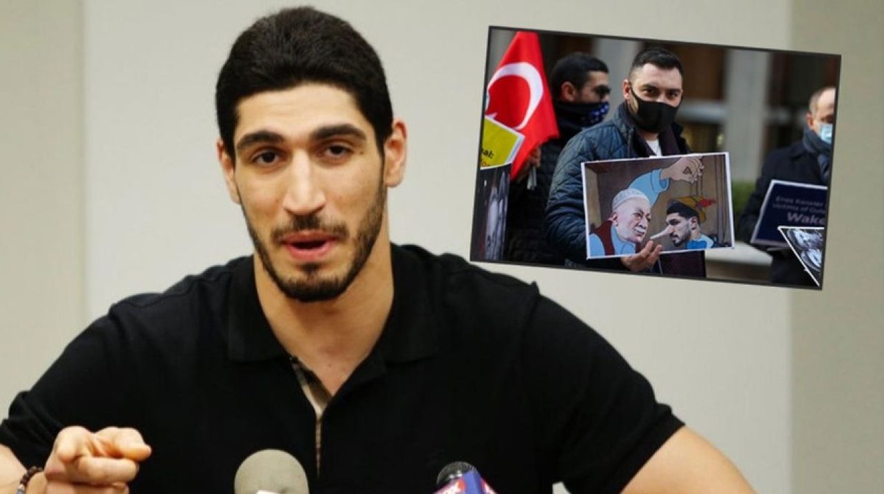 Protestoda, Enes Kanter'i FETÖ elebaşı Fetullah Gülen'in kuklası olarak gösteren karikatürler ve resimli anlatımlar da yer aldı.