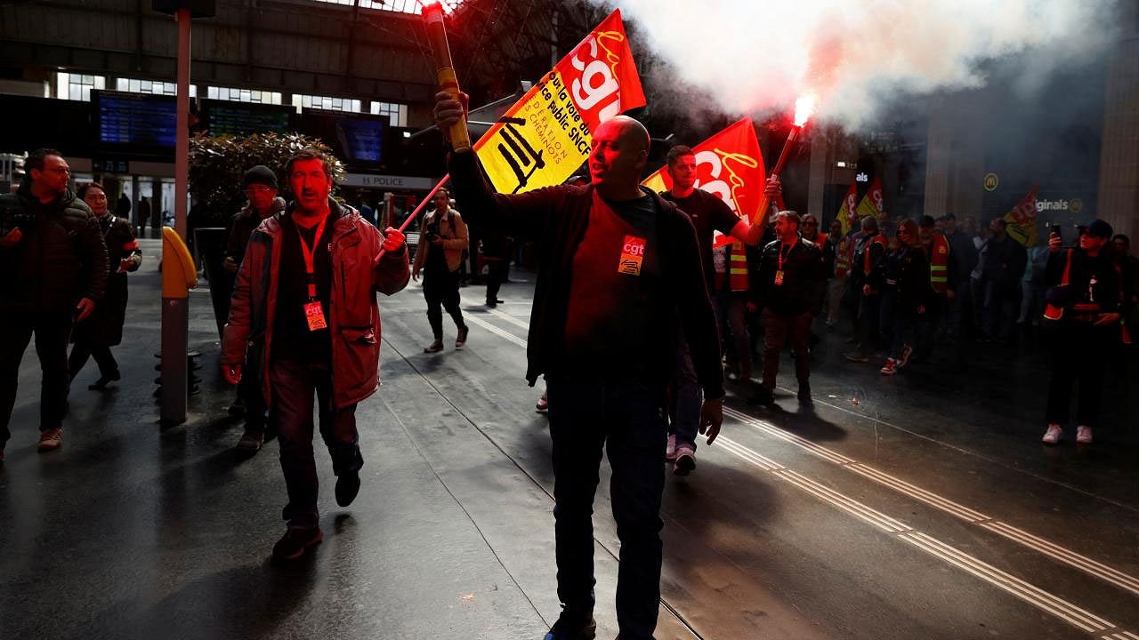 Sosyal medyadaki görüntülerde, çok sayıda gösterici, sendika flamalarıyla Paris'teki Gare du Nord'u bastı.