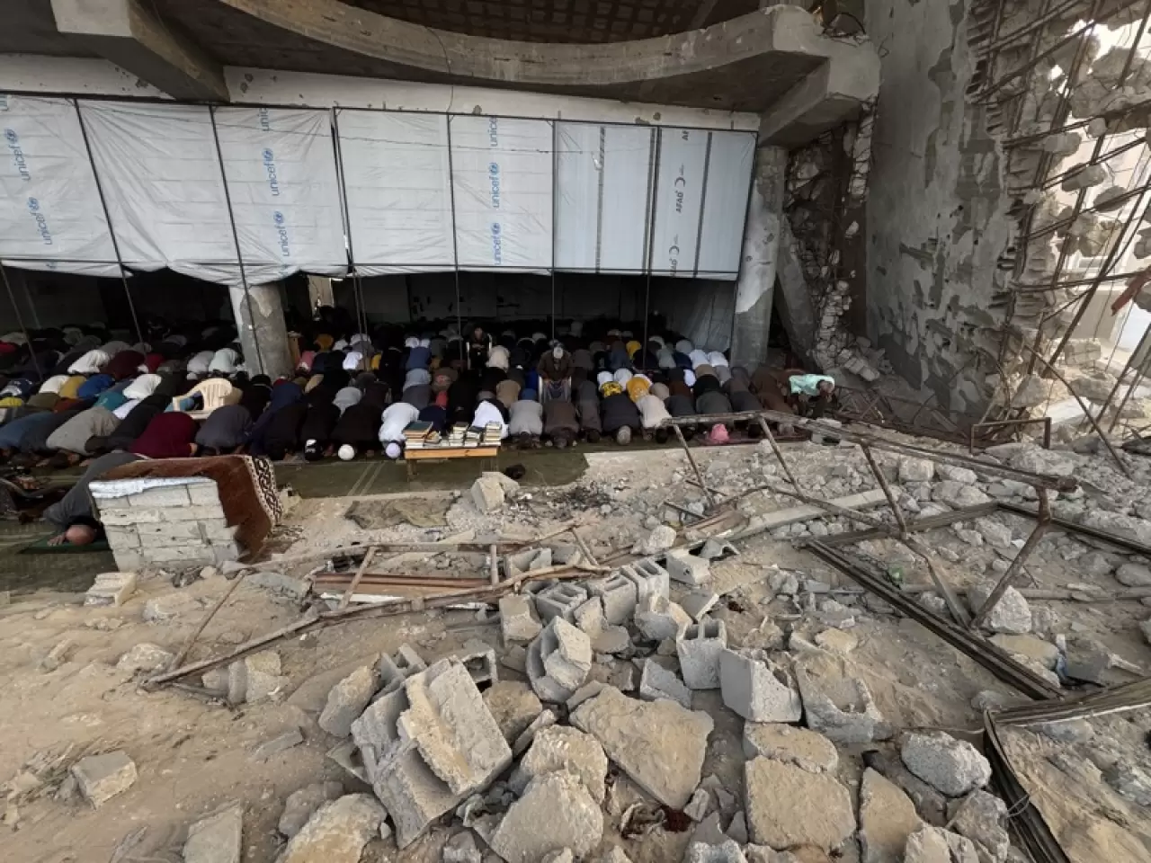 Soykırım ve açlığa maruz kalarak yaşam mücadelesi veren Filistinliler, yıkılmış evlerinin enkazı üzerinde bayram namazlarını eda etti.