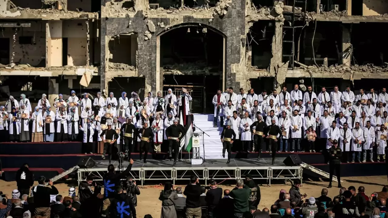 İsrail ordusunun saldırıları sonucu ağır hasar gören Gazze kentindeki Şifa Hastanesi'nde, Sağlık Bakanlığı tarafından uzmanlık belgesi almaya hak kazanan 170 doktor için mezuniyet töreni düzenlendi.