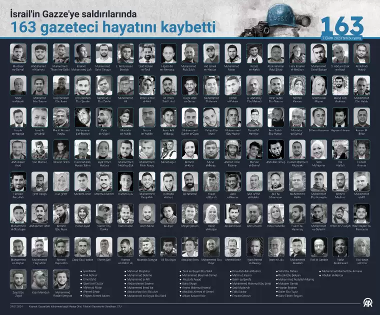 Medya Ofisi tarafından 21 Temmuz'da yapılan açıklamada, İsrail ordusunun saldırıları sonucunda Gazze'de hayatını kaybeden gazeteci sayısının 162 olduğu belirtilmişti.