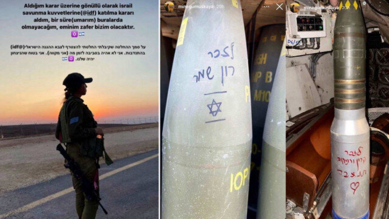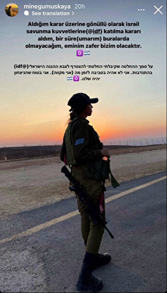 İsrail Savunma Kuvvetleri üniforması ve üstündeki silahlarla poz veren Mine Gümüşkaya, ''Aldığım karar üzerine gönüllü olarak İsrail Savunma Kuvvetleri'ne katılma kararı aldım, bir süre buralarda olmayacağım, eminim zafer bizim olacaktır'' dedi.