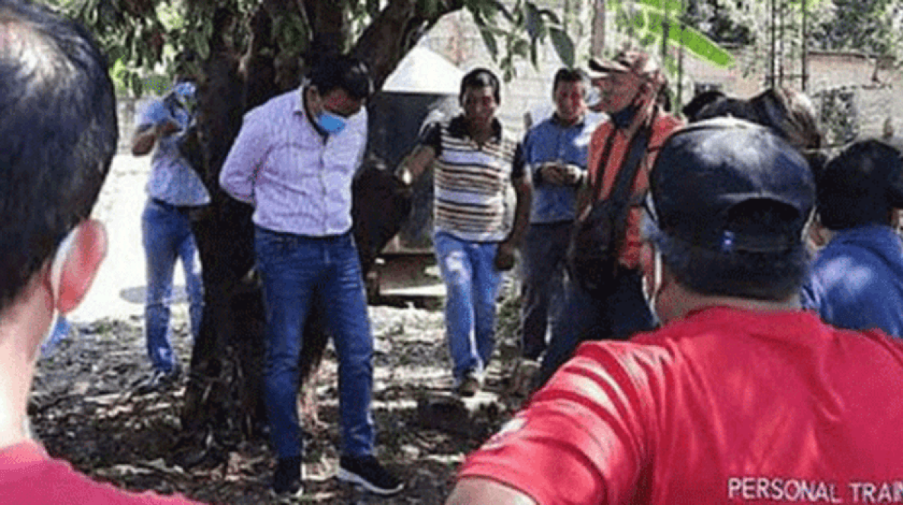 Chiapas halkı, depodaki çatlaklara dikkat çekerek kalitesiz su deposu inşa etmekle suçladıkları Aguilar'ı ormanlık alanda ağaca bağladı.