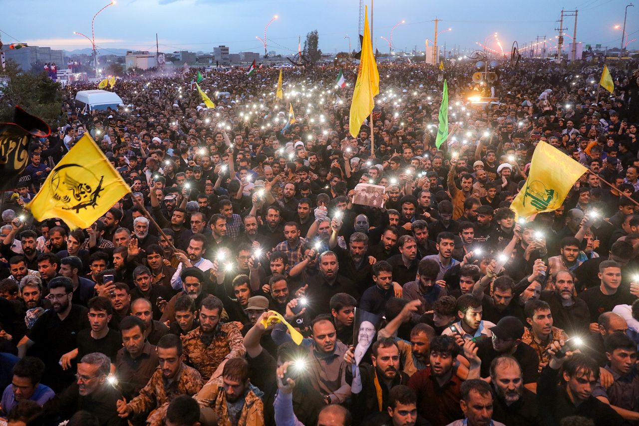 Başkentteki Mehrabad Havaalanına getirilen cenazeler için karşılama töreni düzenlendi. Cenazeler Havalimanı’na indirildiğinde bando takımı Çağrı filminin müziğini çaldı. Karşılama töreninin ardından Reisi ve beraberindeki 7 kişinin cenazeleri Tahran’dan Kum kentine götürüldü. Kentte binlerce İranlı cenazeleri karşılamak için Fatıma-i Masume Türbesi'nde toplandı. Cenazeler dualar eşliğinde türbe içerisine getirilmesinin ardından Cemkeran Camii’ne götürülerek cenaze töreni düzenlendi.