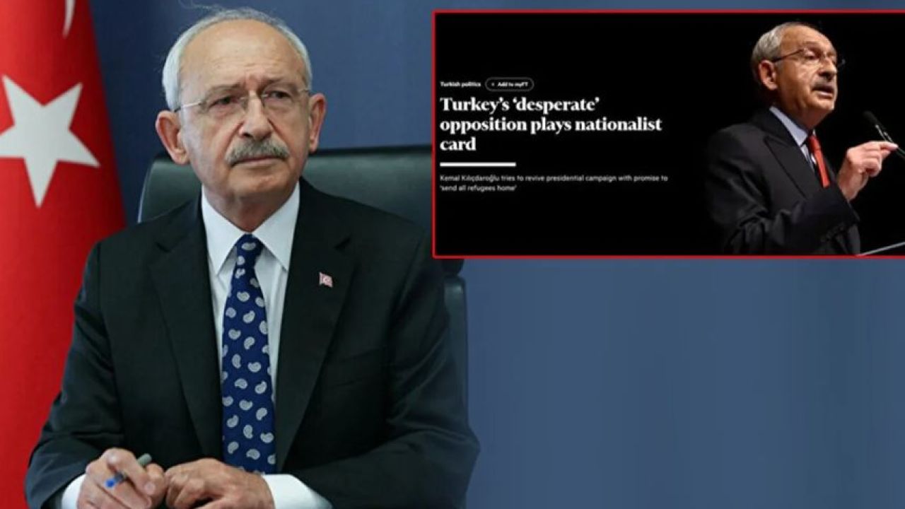 Yeni Şafak'ta yer alan habere göre; İngiltere merkezli Financial Times, Kılıçdaroğlu'nun mevcut konumunu "Türkiye'nin 'çaresiz' muhalefeti milliyetçi kartını oynuyor" başlığıyla ele aldı.