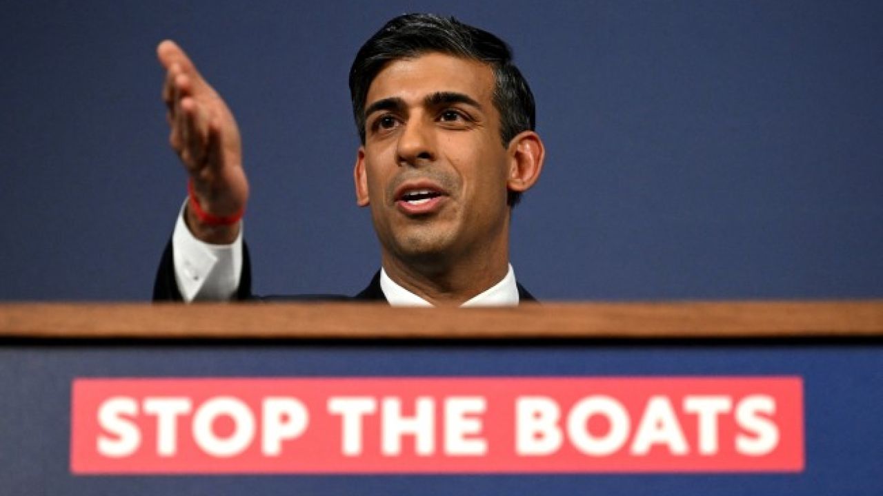 Rishi Sunak, ön yüzünde "(Göçmen) Teknelerini durdur" sloganının yazılı olduğu kürsüde yaptığı konuşmada, İngiltere'ye küçük teknelerle yasa dışı yollardan girenlerin sayısının son 2 yılda dört kattan fazla arttığına dikkati çekti.