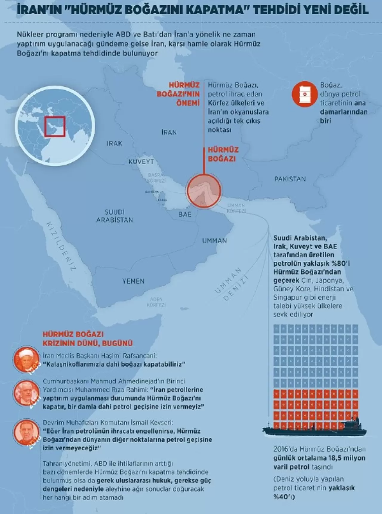 Aralık 2011 – ABD, İran petrolüne yaptırım planlayınca, dönemin Cumhurbaşkanı Ahmedinejad’ın yardımcısı Muhammed Rıza Rahimi, “Boğaz’ı kapatır, bir damla petrol bile gönderilmez” sözleriyle ciddi bir tehditte bulundu.
