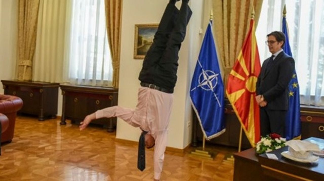 Oryan, Cumhurbaşkanı Pendarovski'nin önünde amuda kalktı.