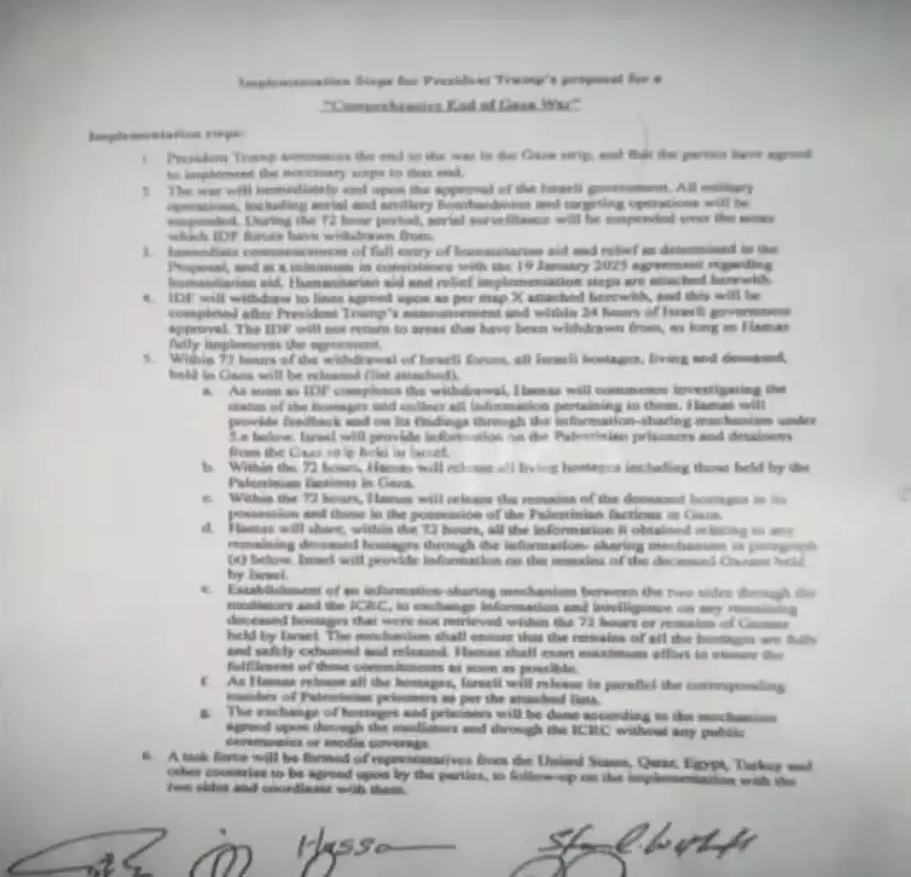 İsrail devlet televizyonu KAN tarafından paylaşılan taslak metne göre, ateşkesin ilanını takiben ilk 24 saat içinde İsrail ordusu, güncellenen harita doğrultusunda belirlenen hattın gerisine çekilecek. Ordunun geri çekilmesinin tamamlanmasının ardından 72 saat içinde Hamas, Gazze Şeridi’ndeki İsrailli esirlerin tamamını teslim edecek. Buna karşılık İsrail, 250 ağır hapis cezası almış Filistinli esiri ve 7 Ekim 2023 sonrası Gazze’den alıkonulan 1700 kişi ile 22 çocuğu serbest bırakacak ve ayrıca İsrail’in öldürdüğü 360 Filistinlinin cenazesi teslim edilecek.