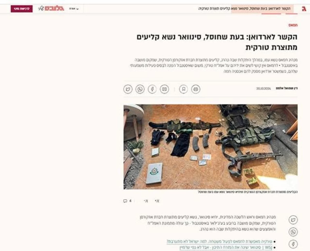 İstanbul merkezli bir şirketin mermilerinin Hamas lideri Sinvar tarafından taşındığını kaydeden gazete, fotoğraf ve videolardan söz konusu tespitin yapıldığını aktardı. Adresi Bağcılar olarak görülen şirketin 65 ülkeye ihracat yaptığını belirten Globes, Türkiye'nin 2011 yılından sonra sınır dışı edilen birçok Hamas liderini ağırladığını savundu.