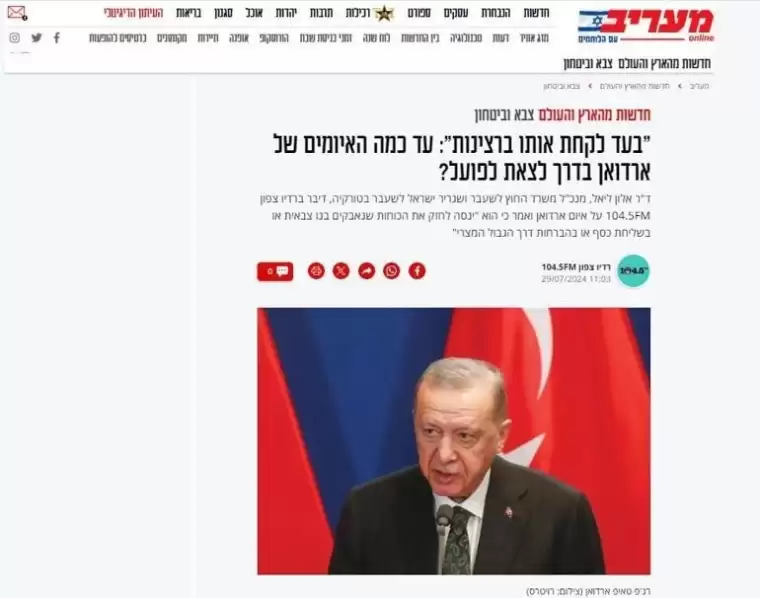 Maariv'teki haberin başlığı 'Ciddiye aldığın için-Erdoğan'ın tehditleri ne kadar gerçekleşecek?' oldu, gazete İsrail'in eski Türkiye Büyükelçisi Alon Liel'in görüşleri sayfaya taşındı. Eski büyükelçiye göre, Türkiye halihazırda İsrail'e savaşan güçlere finansal veya askeri kaynak sağlayabilir, Gazze Şeridi'ne destek için Mısır sınırını kullanabilir.