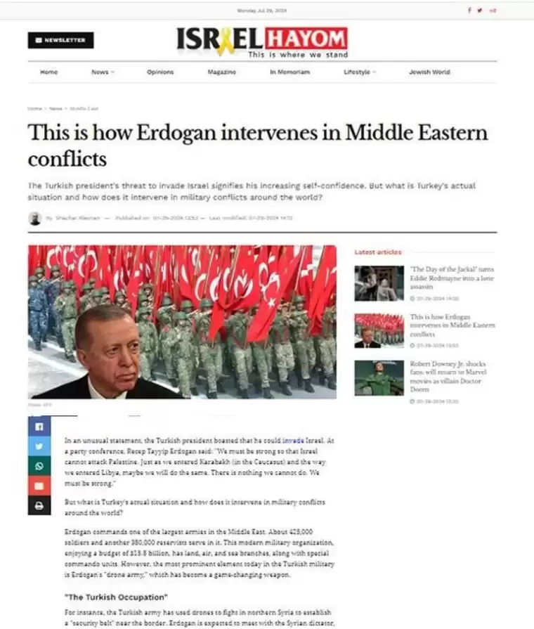 Gazeteye göre, Türk ordusunun özellikle günümüzde en fazla öne çıkan unsuru oyunun kurallarını değiştiren silah 'Erdoğan'ın 'drone ordusu.' Türklerin silahlı insansız hava araçlarını Suriye'deki savaşta kullandığını, Libya'da ise General Halife Hafter'e bağlı güçlerin Türklerin yardımıyla gelişmiş drone saldırılarına uğradığını aktardı. 'Ukrayna'dan Etiyopya'ya' ara başlığı kullanılan haberde Erdoğan'ın damadı Selçuk Bayraktar'ın şirketi Baykar'ın ürettiği Bayraktar TB2 silahlı insansız hava aracı 'amiral gemisi' olarak nitelendi ve Bayraktar TB2'nin Ukrayna'dan Etiyopya'ya dünyanın dört bir yanındaki çatışmalarda Ankara'nın parmak izi haline geldiği vurgulandı.Israel Hayom, 'Türkiye'nin Akdeniz havzası ve Arap dünyasındaki agresif tavırları Osmanlı İmparatorluğu'nun anılarını canlandırıyor' dedi.