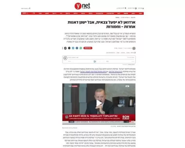 Yediot Ahronot 'Erdoğan askeri adım atmayacak ancak başka ciddi kaygılar var' başlığını attı, Türkiye'nin İsrail'e karşı savaşan herkese yardım edeceği ya da silah sağlayacağı yönünde endişeler bulunduğunu yazdı.