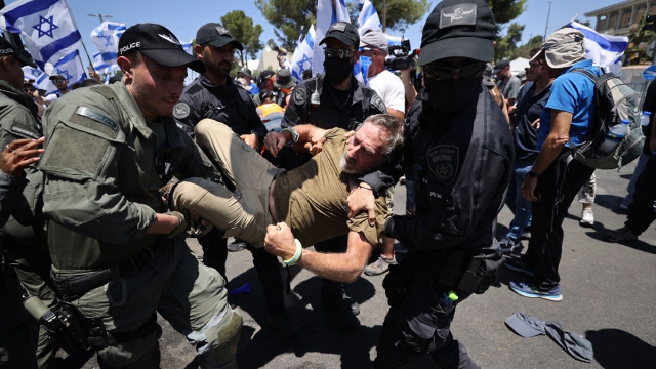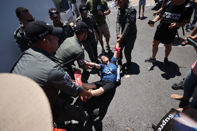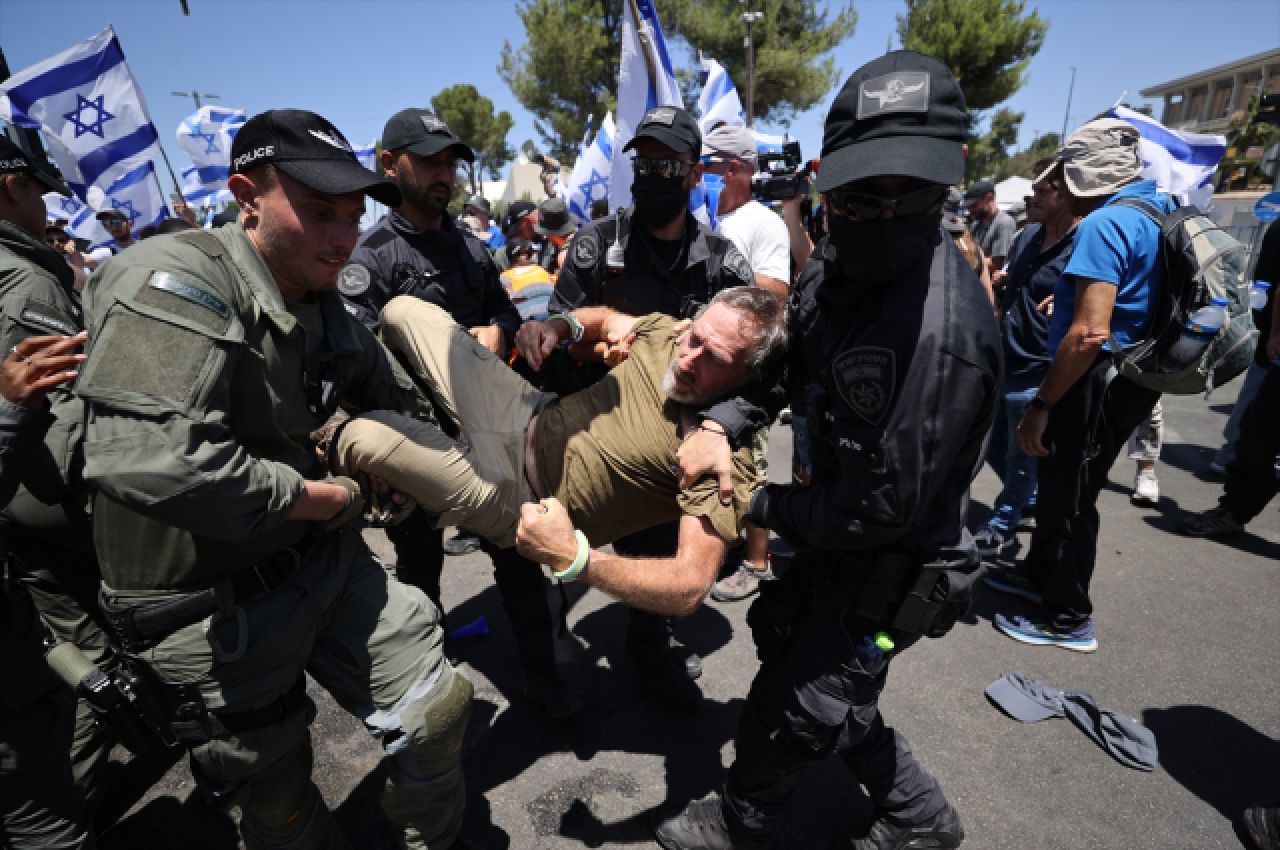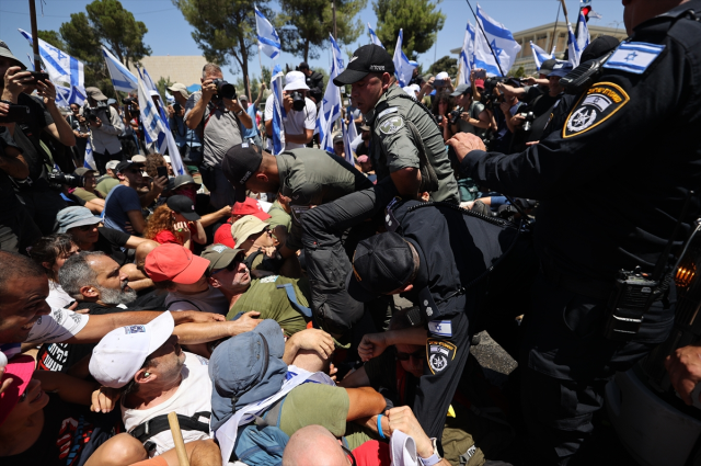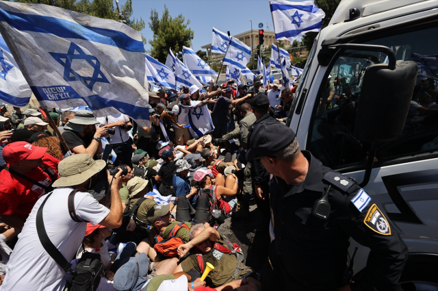 İsrail'de Başbakan Netanyahu liderliğindeki koalisyonun Yüksek Mahkeme'nin hükümet üzerindeki denetimini kaldıracak yasa tasarısını son onay için Meclis'e getirmesi üzerine Batı Kudüs'te Meclis binası çevresinde düzenlenen protestolar bugün de devam etti. Netanyahu hükümetinin tartışmalı yargı düzenlemesine karşı protestoların odak noktası, Yüksek Mahkemenin yürütmenin üzerindeki denetimini kaldıracak yasa tasarısının onaylanacağı Batı Kudüs'teki İsrail Meclisi çevresi oldu. Yüzlerce gösterici, sabahın erken saatlerinden itibaren oluşturdukları insan zinciriyle Meclis çevresindeki yolu kapatmaya çalıştı. İsrail polisi ise atlı birlikler, TOMA ve güç kullanarak göstericileri alandan uzaklaştırmaya çalıştı.