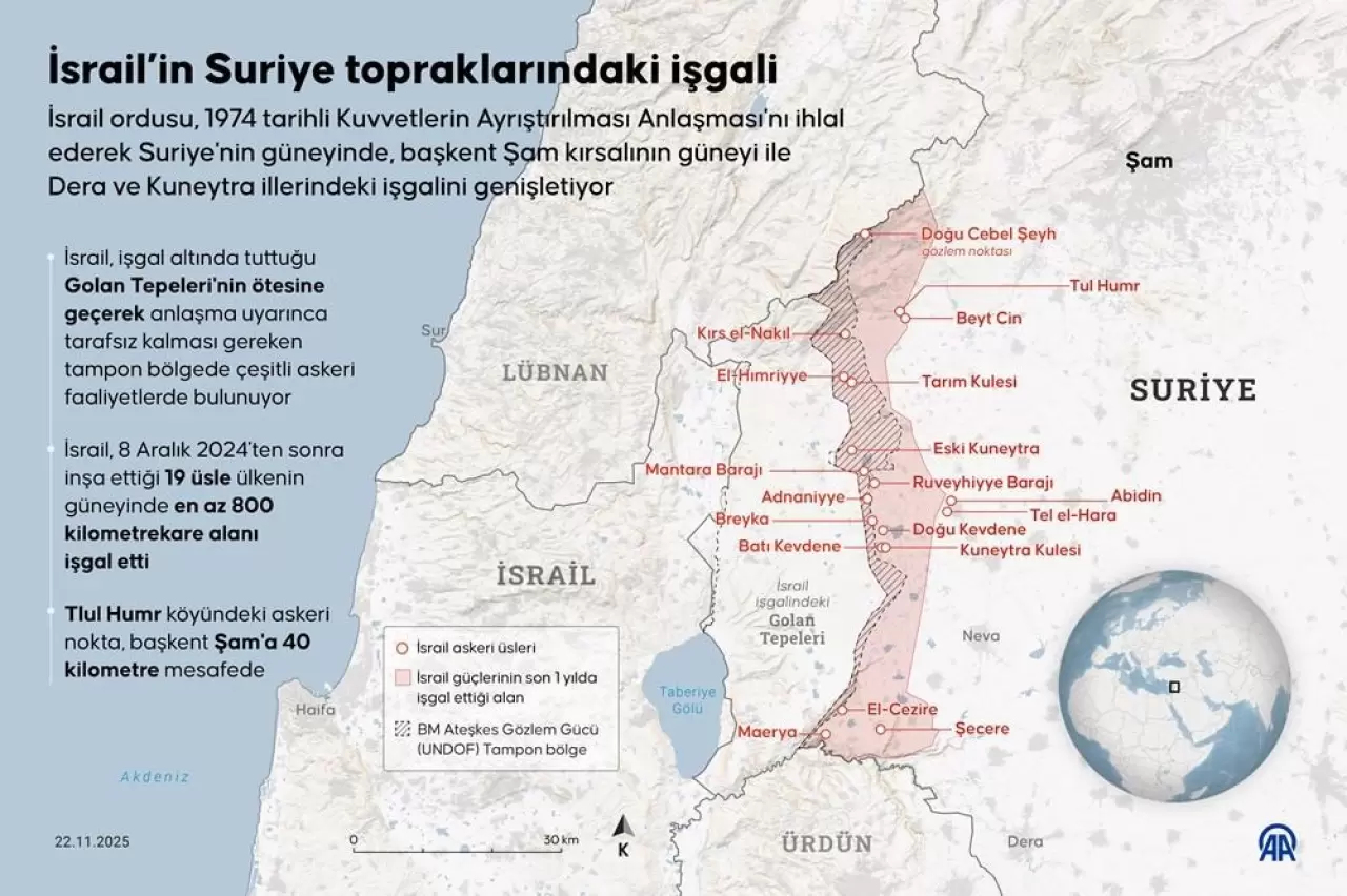 Anadolu Ajansı muhabirinin hesaplamalarına göre İsrail, işgal ettiği Golan Tepeleri’ne ek olarak son bir yıl içinde 800 kilometrekarelik Suriye toprağını daha ele geçirdi.