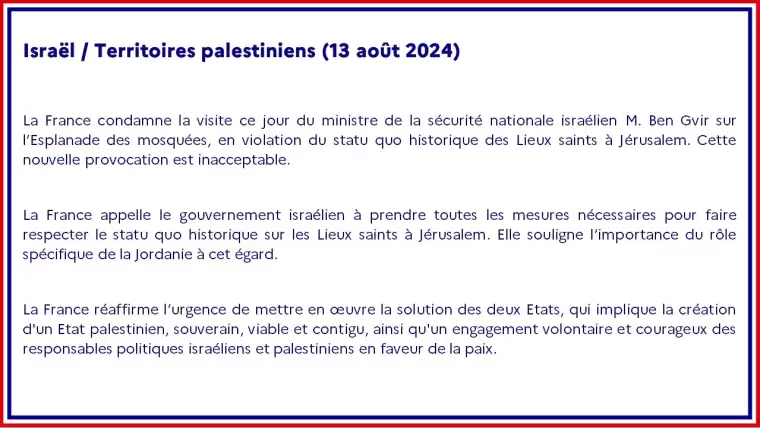 Fransa Dışişleri’nden yapılan açıklamada, “Fransa, İsrail Kamu Güvenlik Bakanı Sayın Ben Gvir'in Kudüs'teki kutsal mekânların tarihi statükosunu ihlal ederek bugün gerçekleştirdiği ziyareti kınamaktadır. Bu yeni provokasyon kabul edilemez. Fransa, İsrail hükümetini Kudüs'teki Kutsal Yerlerin tarihi statükosuna saygı gösterilmesini sağlamak üzere gerekli tüm tedbirleri almaya çağırır. Ürdün'ün bu konudaki özel rolünün önemini vurgular. Fransa, egemen, yaşanabilir ve bitişik bir Filistin Devleti'nin kurulmasının yanı sıra İsrailli ve Filistinli siyasi liderlerin barışa yönelik gönüllü ve cesur bir taahhütte bulunmalarını gerektiren iki devletli çözümün uygulanmasının aciliyetini bir kez daha teyit eder” ifadeleri kullanıldı. Suudi Arabistan Dışişleri Bakanlığı kutsal mekanlara saygı gösterilmesi gerektiğine dikkat çekerek, “Dışişleri Bakanlığı, Suudi Arabistan Krallığı'nın İsrail işgal yetkilileri ve bir dizi yerleşimcinin kutsal El-Aksa Camii'ne yaptığı açık ve tekrarlanan saldırıları en güçlü şekilde kınadığını ifade eder.