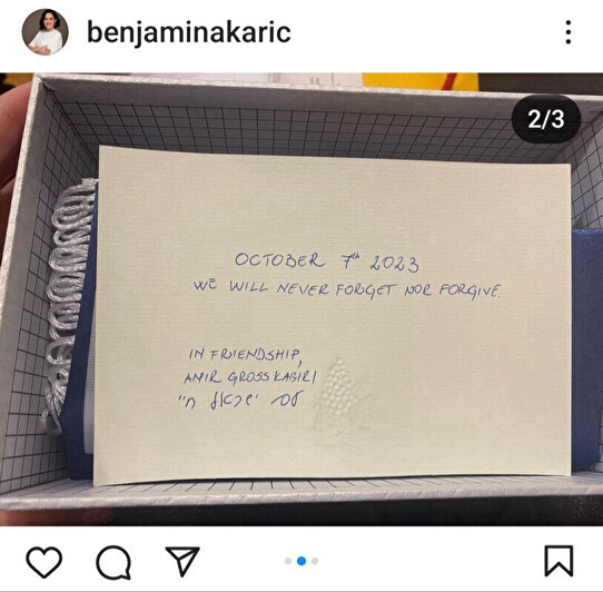 "Şahsın saldırıları Filistin'deki masum sivillerin öldürülmesine karşı paylaşımlar yapmam üzerine daha da arttı. O günden itibaren Amir Gross Kabiri, gerek açık şekilde gerekse kişisel mesaj atarak öldürülen çocuk resimleri gönderdi, beni Hamas'ı desteklemekle suçladı, Gazze'deki sivillerin öldürülmesine karşı çıktığım için şahsıma suçlamalar yöneltti."