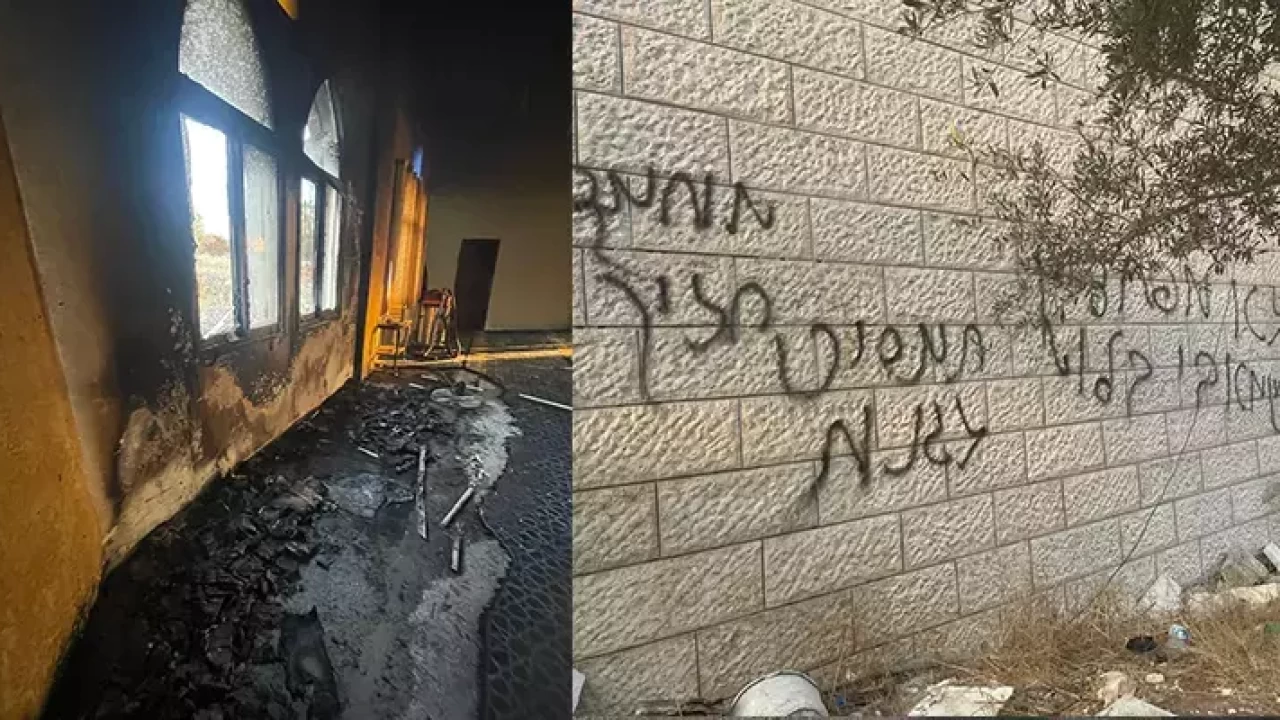 Beldedeki el-Hacce Hamide Camii'ni ateşe veren saldırgan İsrailliler, caminin duvarlarına ırkçı yazılar yazdı.