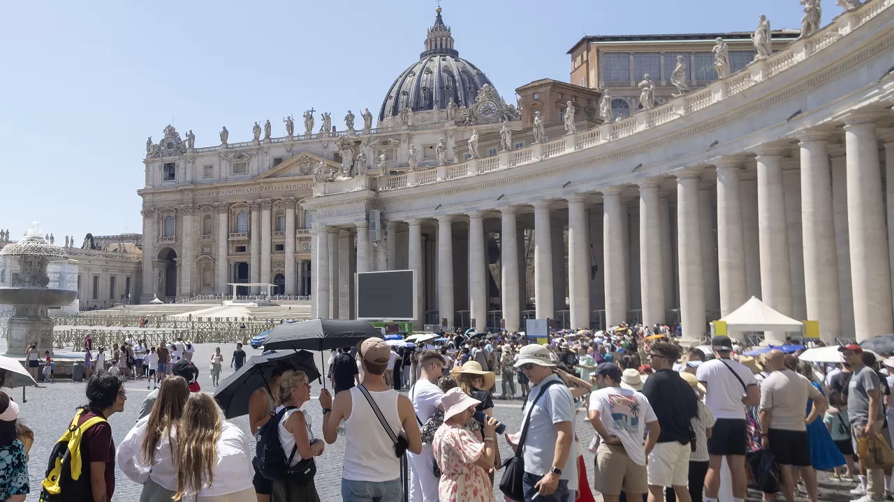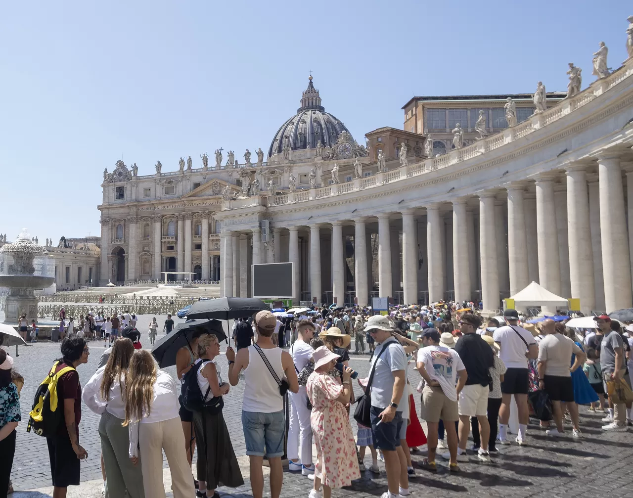 Vatikan'ı ziyaret eden turistler, Aziz Petrus Bazilikası önünde şemsiyelerle güneşten korunmaya çalıştılar.