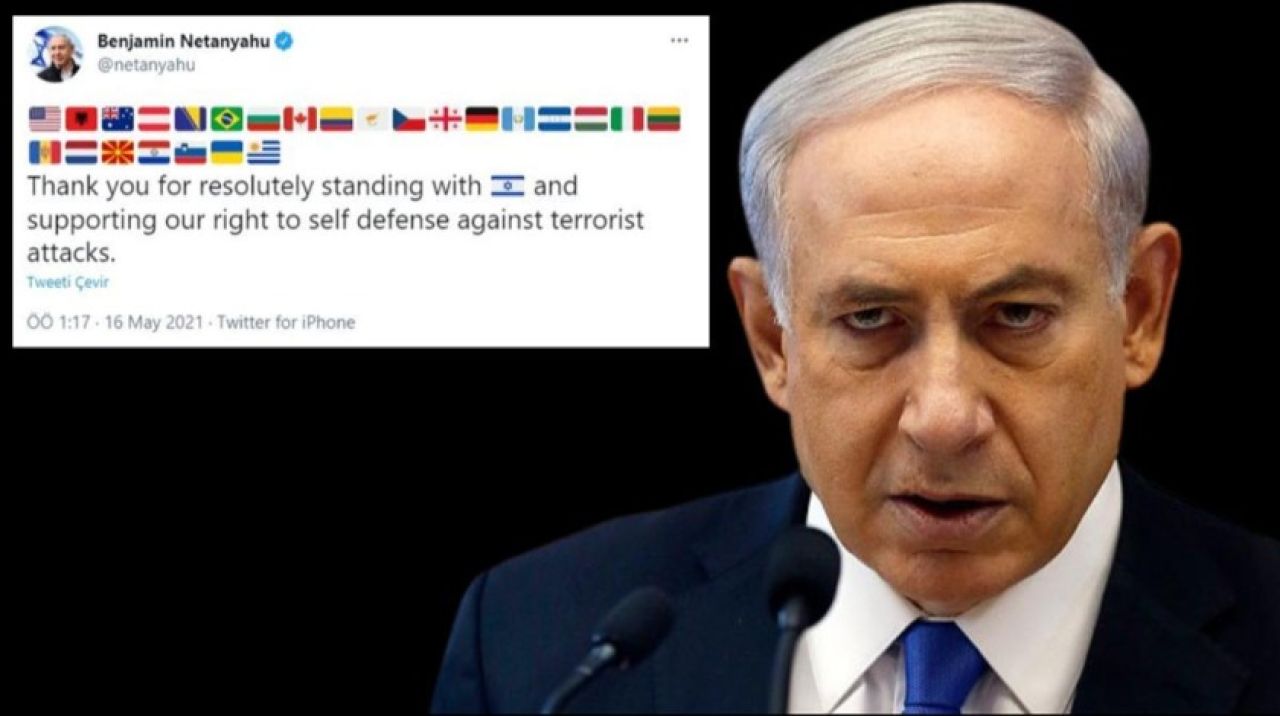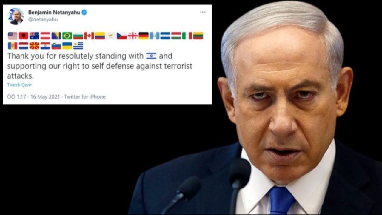 Netanyahu'nun paylaştığı mesajında bayraklar sırayla; ABD, Arnavutluk, Avustralya, Avusturya, Bosna Hersek, Brezilya, Bulgaristan, Kanada, Kolombiya, Güney Kıbrıs, Çekya, Gürcistan, Almanya, Guatemala, Honduras, Macaristan, İtalya, Litvanya, Moldova, Hollanda, Makedonya, Paraguay, Slovenya, Ukrayna ve Uruguay ülkelerine ait.DHA