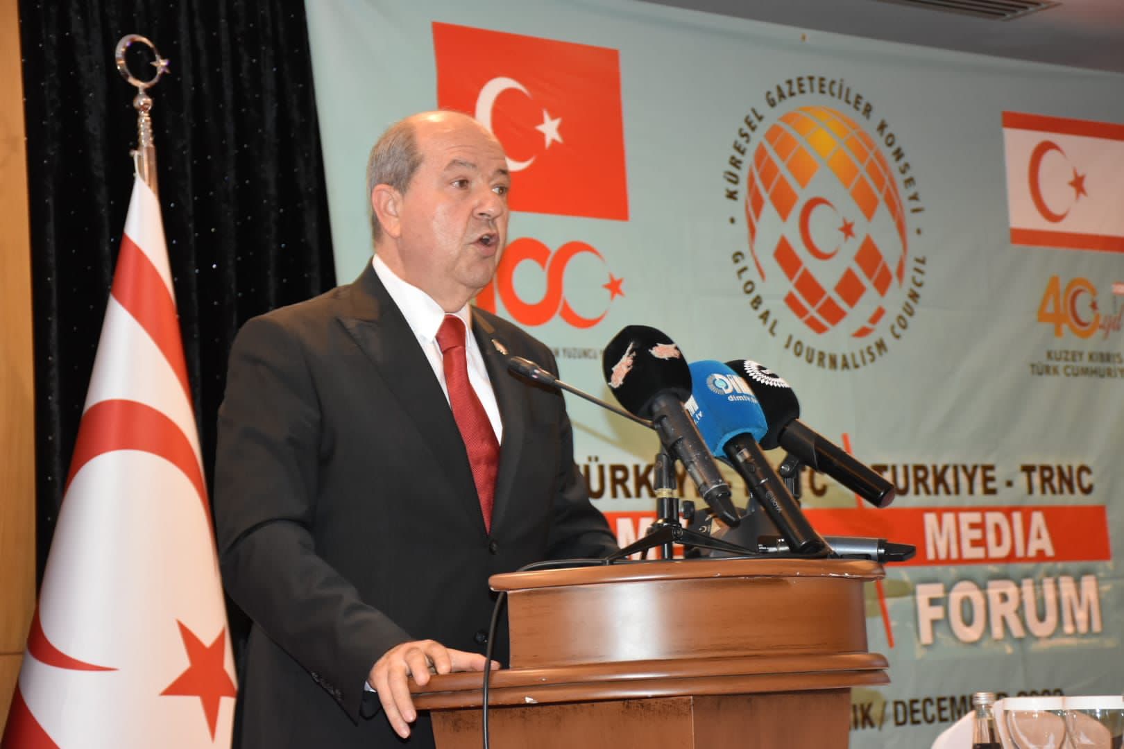 KKTC dışında yaşayan ada vatandaşlarına da seslenen Cumhurbaşkanı Ersin Tatar, ”Londra’da önce iki saat tren. Sora da 25. kattaki ofisine çıkmak için asansör bekliyorsun. Ben diyorum ki, gel buraya dünya dijitalleşti, işlerini öyle idare edebilirsin. Bizden kimse devletimizden vazgeçmemizi beklemesin. Federasyon deyip başkasının boyunduruğunun altına girmeye razı olamayız. Devletimiz tanınmadıkça anlaşma olmayacaktır. Bu çalıştay bizim çabalarımıza medya desteği sağlıyor. Küresel Gazeteciler Konseyi’ne, tüm gazeteci katılımcılara ve değerli dostum konsey başkanı Dim’e çok teşekkür ederim” diyerek sözlerini tamamladı.