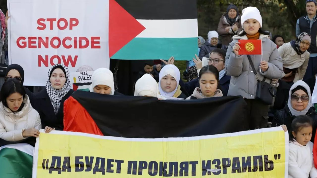 Kırgızistan ve Filistin bayrakları taşıyan göstericiler, "Soykırıma hayır", "Filistin'e özgürlük", "İsrail'e lanet olsun" yazılı dövizler taşıdı.