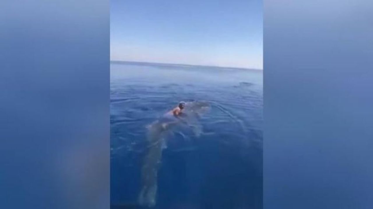 Balığın yüzgeçlerine tutunarak tekneden sırtına atlayan adam sevinç çığlıkları içinde denize açılmaya devam etti.