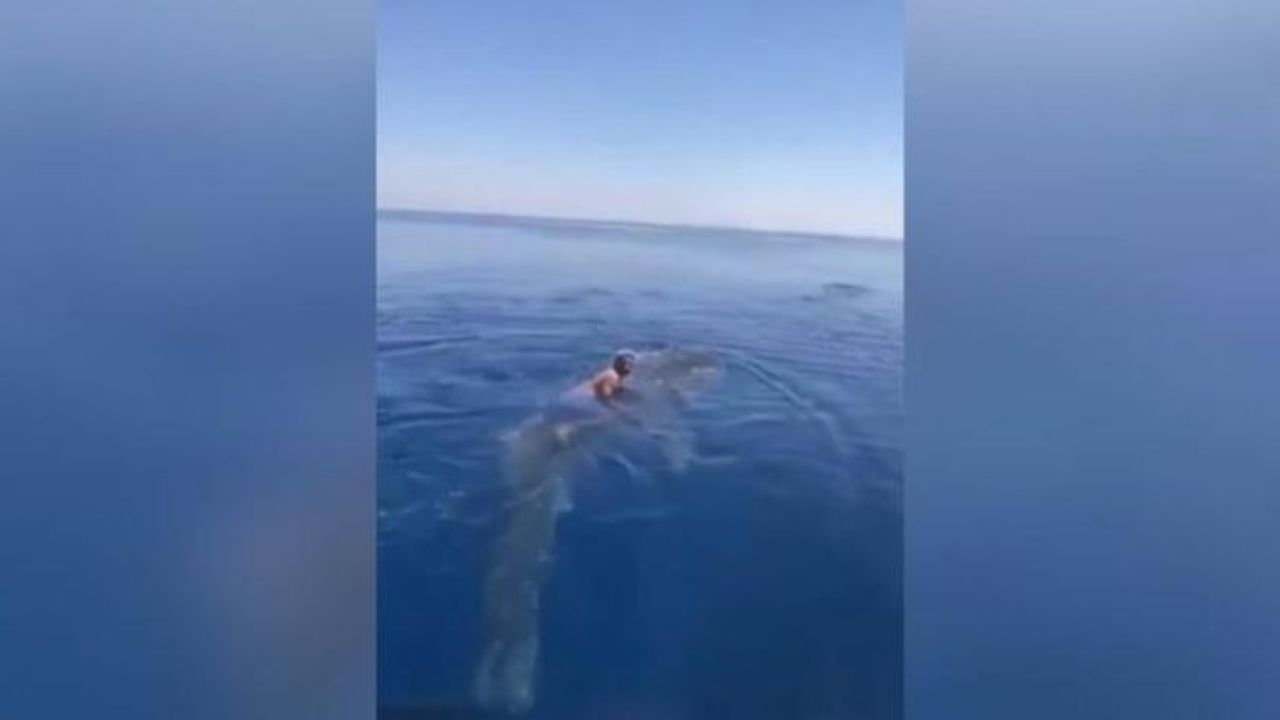 Suudi Arabistan’ın bası sahilinde bir balıkçı teknesiyle açıldıktan sonra yanlarına gelen bir balina köpek balığının üzerine çıkan adam, köpek balığı ile denize açıldı.