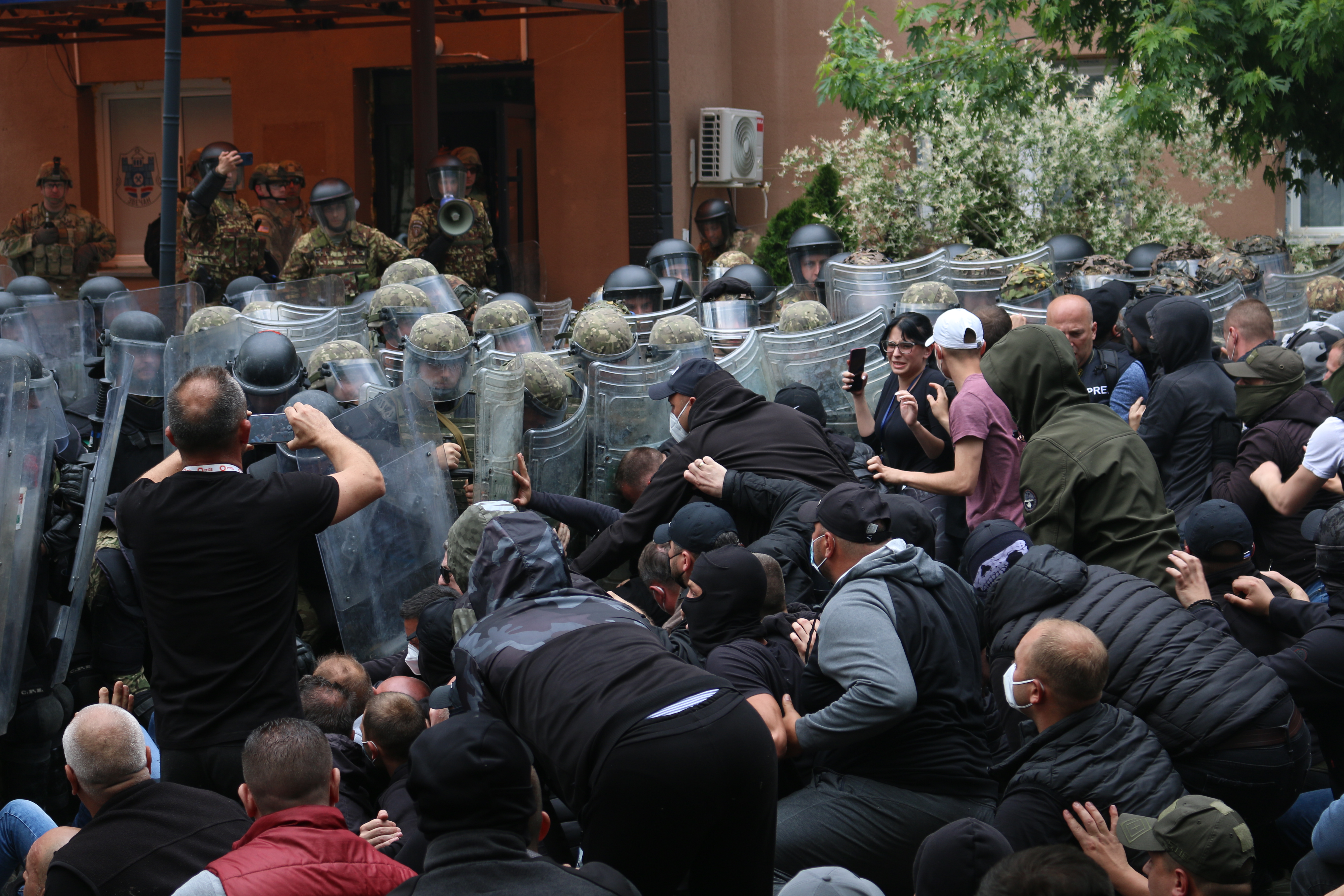 NATO'nun Kosova'daki Barış Gücü (KFOR), belediye binası önündeki kalabalığı göz yaşartıcı gaz kullanarak dağıtmaya çalıştı, protestocular KFOR güçlerine sert cisimler atarak karşılık verdi.