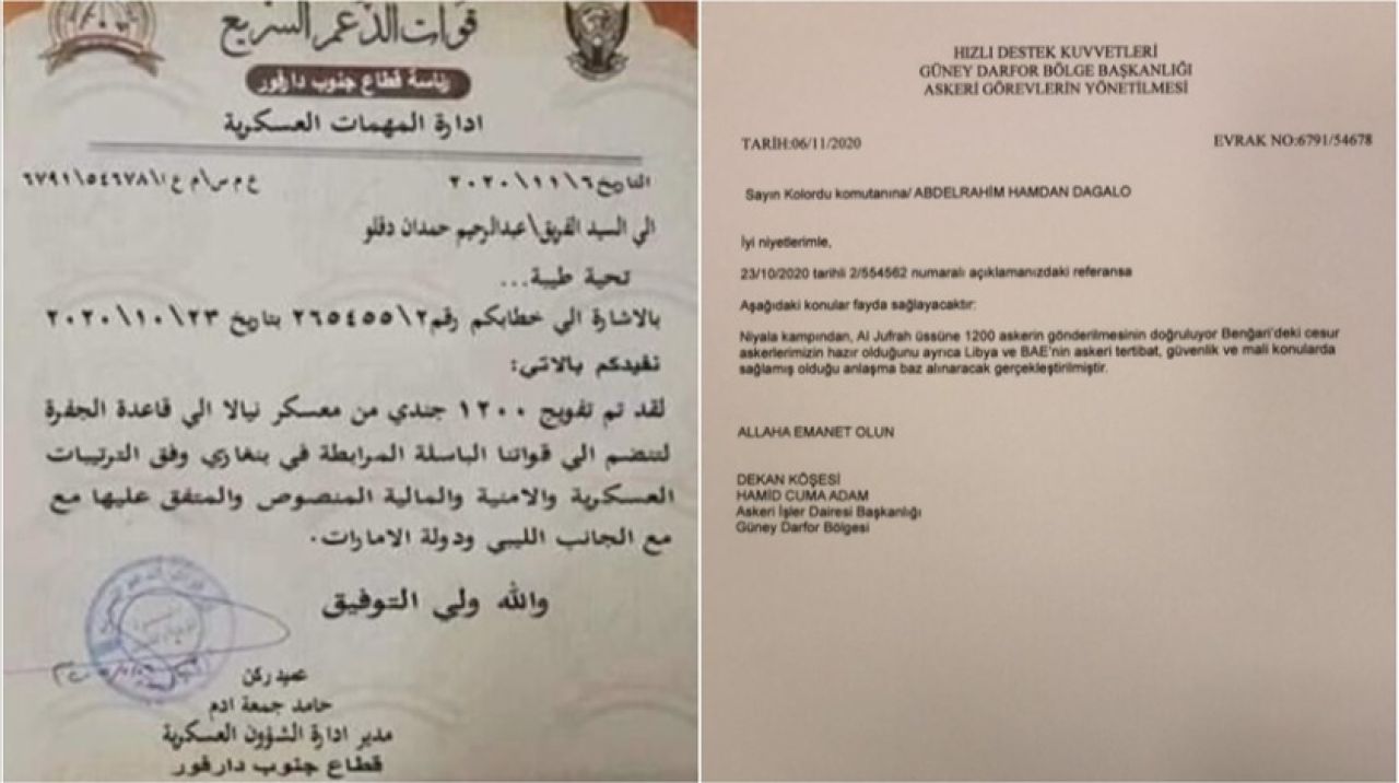 Kolordu Komutanı Muhammed Hamdan Dagalo'ya hitaben 6 Kasım'da yazılan mektupta, Hafter'e bağlı güçler ve BAE'nin askeri tertibat, güvenlik ve mali konularda sağlamış olduğu anlaşma temel alınarak hazırlanan 1200 kişilik milis grubun Niyala kampından Cufra üssüne gönderilmek için hazır olduğu bilgisi yer aldı.