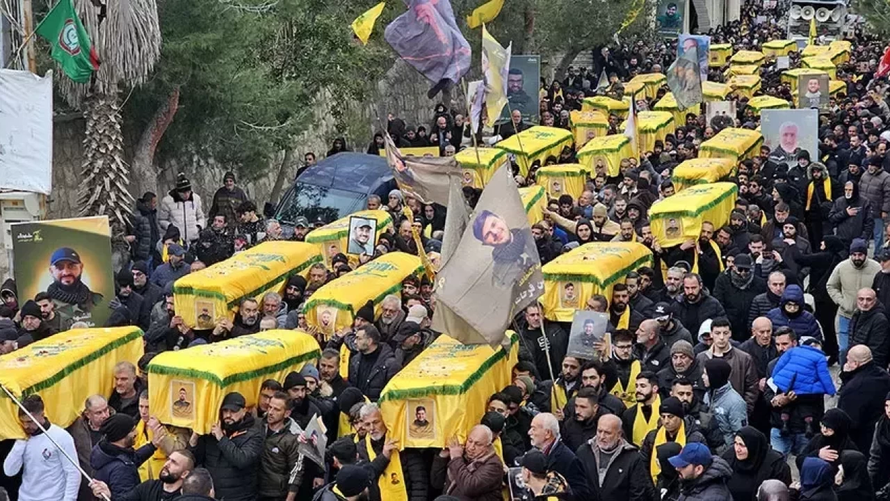 Lübnan'ın Bint Cubeyl bölgesindeki Aynata beldesinde, son çatışmalarda hayatını kaybeden 32 Hizbullah mensubu son yolculuğuna uğurladı. Cenazeler, omuzlar üzerinde taşınarak köy meydanına kadar taşındı.