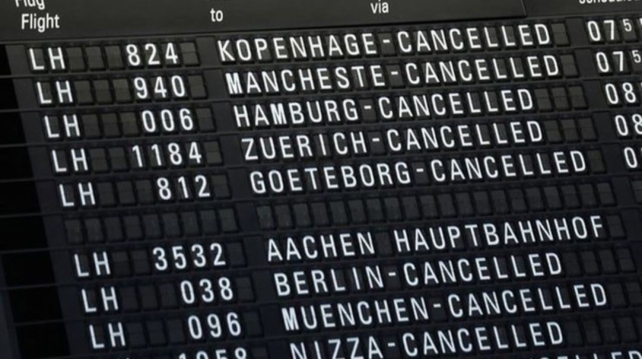 Frankfurt Havalimanı'ndaki uçuş tablosu, Avrupa ve transatlantik bölgelerde iptal edilen uçuşları gösteriyor. İki günlük bu grev nedeniyle iki gün boyunca yapılması planlanan 6 bin uçuştan sadece 2 bin 400'ü yapılabilecek.