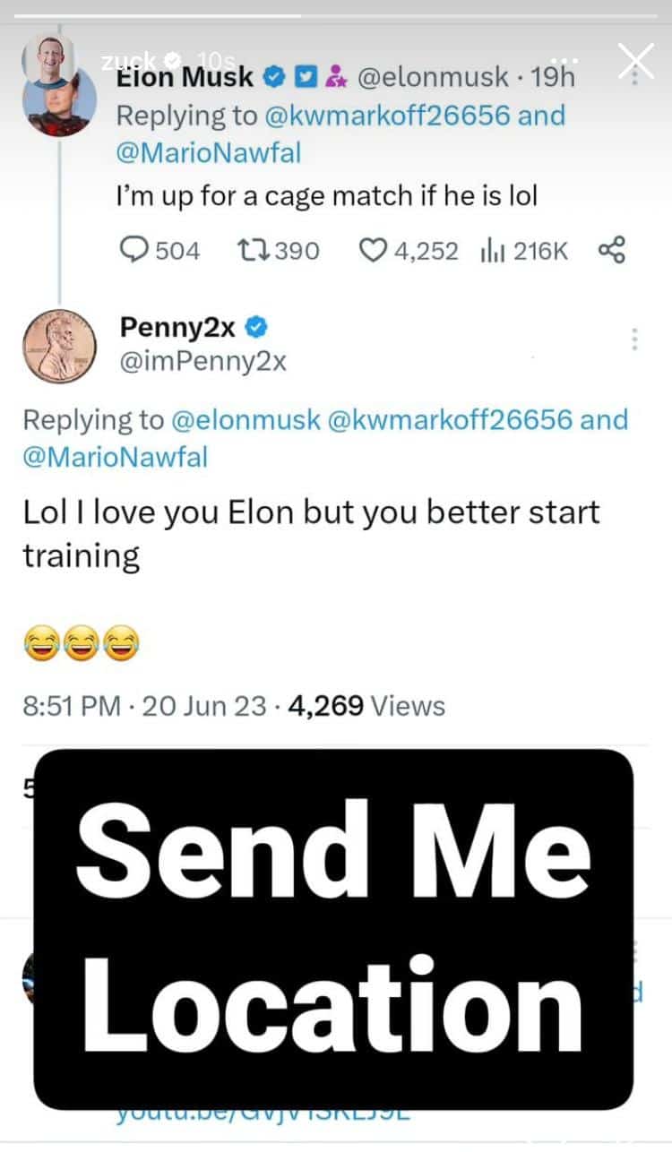 Musk’ın söz konusunu tweet’ini ‘story’ olarak paylaşan Zuckerberg “Bana konum gönder” diyerek kafes dövüşü teklifini kabul etti.