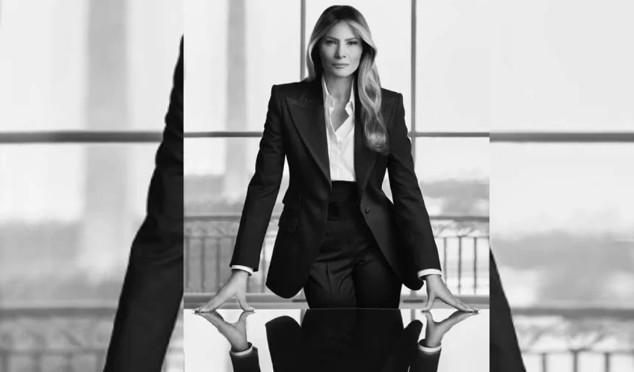 Melania Trump, fotoğrafta doğrudan kameraya bakıyor ve ellerini önündeki masanın üzerine dik bir şekilde koyuyor. Arka planda ise Washington Anıtı görülüyor.