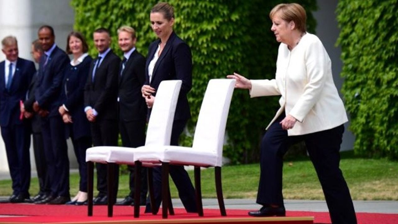 Almanya Başbakanı Angela Merkel'in, Danimarka Başbakanı Mette Frederiksen'ı karşılama töreninde tekrar bir titreme krizinin yaşanmaması için sandalyeyle önlem alındı.