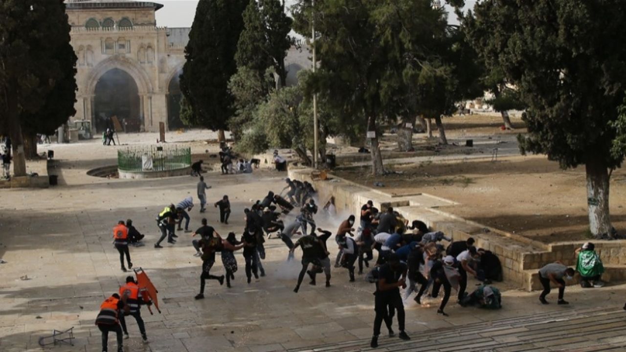 Mescid-i Aksa’ya baskın düzenleyen İsrail polisi, Filistinlilere göz yaşartıcı gaz, plastik mermi ve ses bombalarıyla müdahale etti.