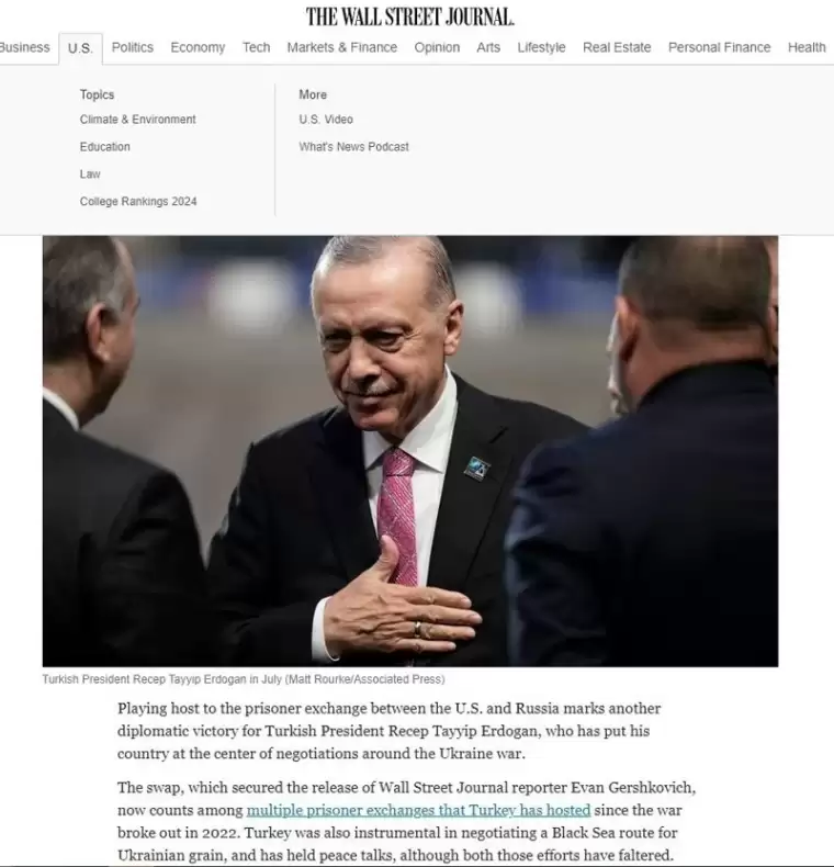 MİT'in tarihi operasyonu hakkında Türkiye'ye övgüler dizen ABD basını Wall Street Journal gazetesi "Mahkum Takası Batı'ya Türkiye'nin Aracı Olarak Değerini Hatırlatıyor" başlıklı haber yayımladı. Haberde, "ABD ve Rusya arasındaki esir takasına ev sahipliği yapmak, ülkesini Ukrayna savaşıyla ilgili müzakerelerin merkezine yerleştiren Türkiye Cumhurbaşkanı Recep Tayyip Erdoğan için bir başka diplomatik zafer anlamına geliyor." ifadelerine yer verildi.