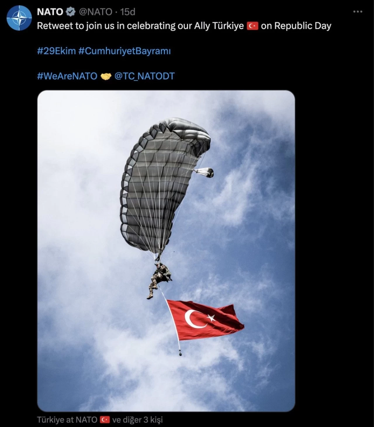 Bu kapsamda NATO, Türkiye Cumhuriyeti'nin 29 Ekim Cumhuriyet Bayramı nedeniyle kutlama mesajı yayınladı.