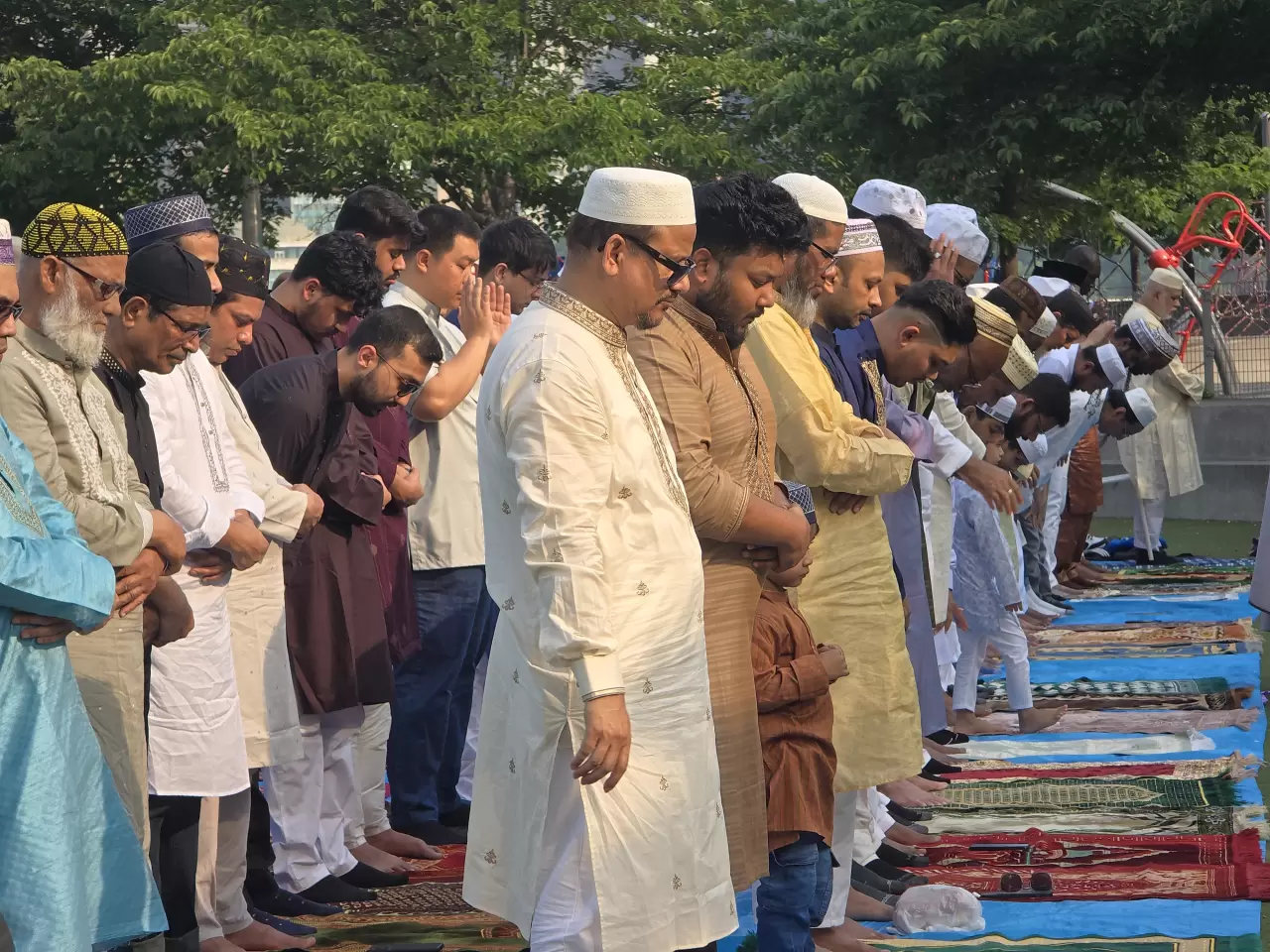 Dünyanın dört bir yanındaki Müslümanlar, bayram namazı kılıyor. ABD'nin New York kentinde farklı milletlerden Müslümanlar, bayram namazı için saf tuttu. Müslümanlar, sıcak hava nedeniyle bayram namazını Hunter's Point South Park ve Sunnyside Park'ta eda etti.