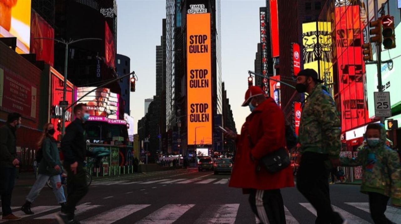 Şehrin en kalabalık mekanı Times Meydanı'nda bulunan dijital dev ekranda, "Pensilvania'da yaşıyor. 251 masum insanı katletti. Gülen'i durdurun" şeklinde ifadelerin yer aldığı görüldü.