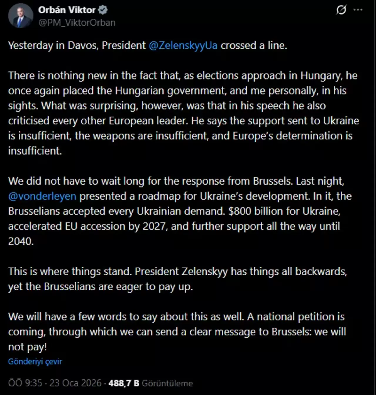 Macaristan Başbakanı Viktor Orban, Dünya Ekonomik Forumu'nun gerçekleştirildiği İsviçre'nin Davos kasabasında konuşma yapan Ukrayna Devlet Başkanı Zelenski'yi sosyal medya hesabından eleştirdi.