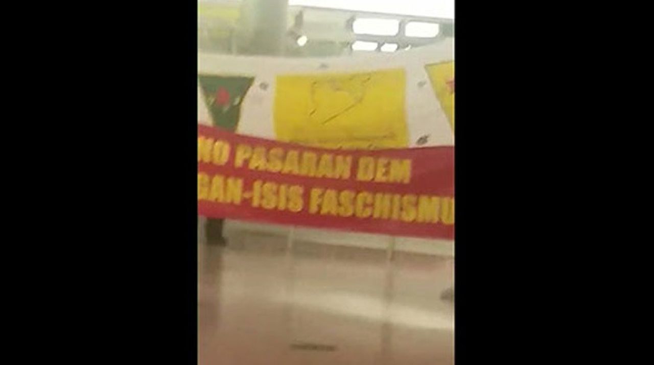 Eli kanlı terör örgütü PKK/YPG'nin yandaşları, Almanya'da örgütü simgeleyen bez parçaları ile havalimanında slogan attı.