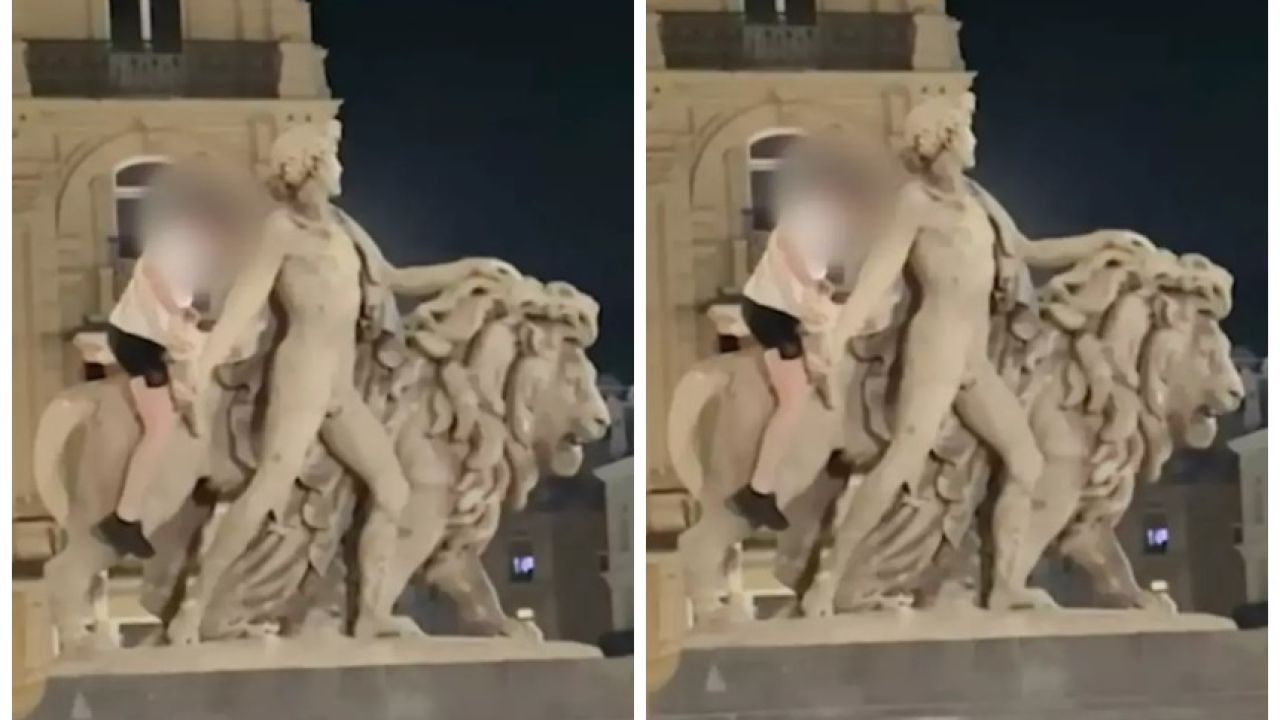 Alkollü olduğu iddia edilen adam, Belçika'daki Brüksel Menkul Kıymetler Borsası'nda, üzerinde meşaleli bir adamın da bulunduğu aslan heykeline binmeye çalışırken görüntülendi.