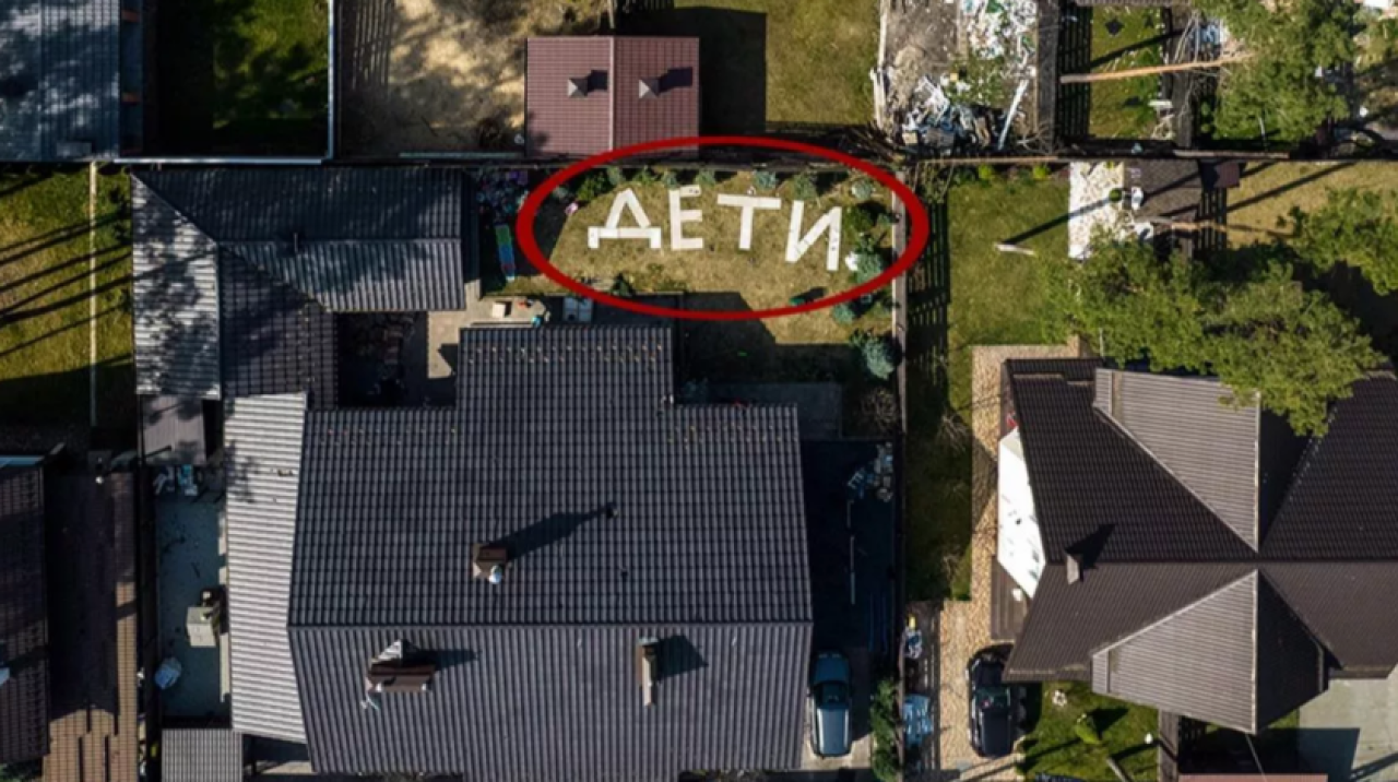 Savaşın ağır izlerini taşıyan kentte bir aile, Rusya'nın saldırılarına karşı evinin bahçesine mermer kullanarak "çocuklar var" yazdı.