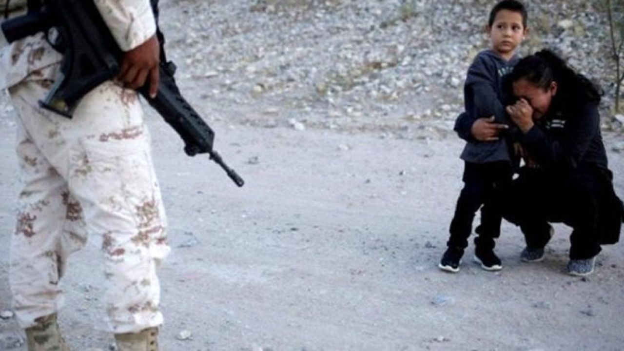 Pazartesi günü alacakaranlıkta çekilen karede, Guatemala'daki memleketinden Meksika'nın sınır kenti Ciudad Juarez'a gelen Ledy Perez çömelmiş ağlarken, altı yaşındaki oğlu Anthony Diaz,meydan okuyan bir tavırla Meksikalı askere bakıyor. Objektife yazlık üniforması içinde bir asker omzundan sarkan tüfeğiyle yansıyor.