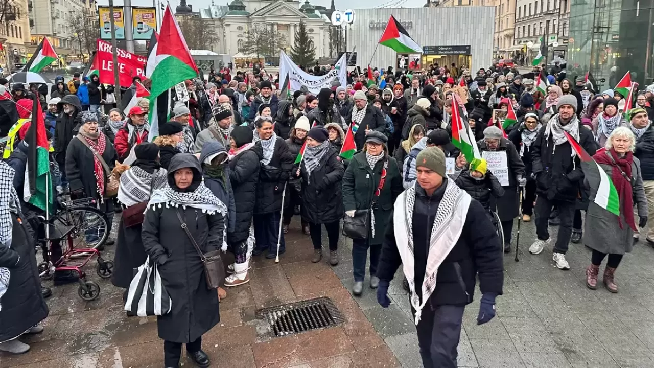Çok sayıda sivil toplum kuruluşunun çağrısıyla Odenplan Meydanı'nda toplanan yüzlerce kişi, İsrail ordusunun 10 Ekim'de sağlanan ateşkesi ihlal ederek Gazze'ye hava saldırılarında bulunmasına ve insani yardım girişini kısıtlamasına tepki gösterdi.