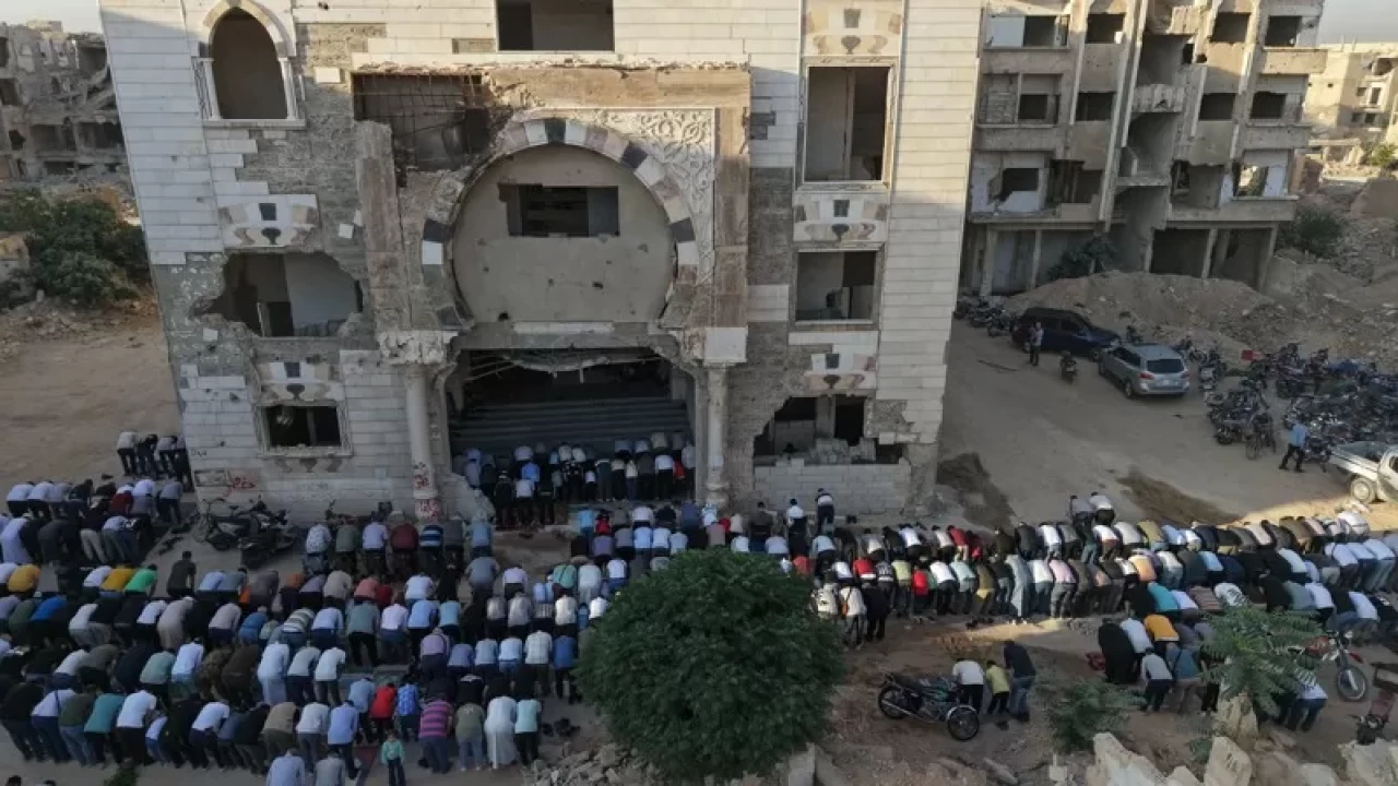 Beşşar Esed rejiminin yıkılmasının ardından ilk Kurban Bayramı namazını kılan cemaat, tekbirler eşliğinde saf tuttu.