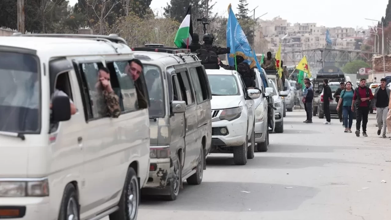Ellerinde PKK/YPG'ye ait paçavraları taşıyan teröristler, Savunma Bakanlığına bağlı güçlerin himayesinde Halep'ten çıktı.